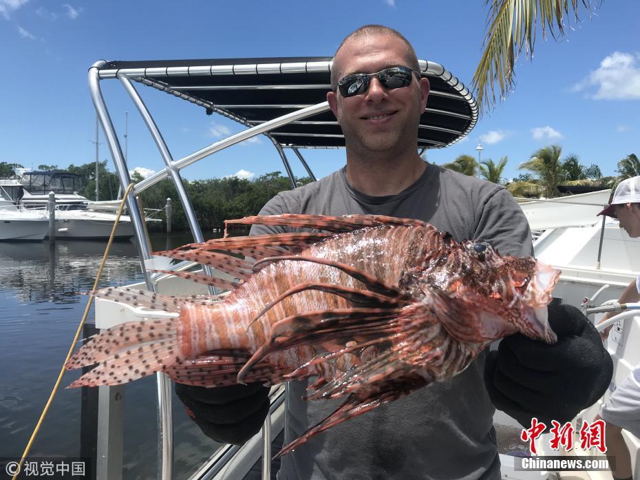 8月21日訊(具體拍攝時(shí)間不詳),近日,來(lái)自長(zhǎng)島的Timothy Blasko打破了記錄,他捕獲了大西洋最重的獅子魚(yú)。37歲的Timothy Blasko是一名技術(shù)精湛的捕魚(yú)者,當(dāng)天,他和朋友們?cè)诜鹆_里達(dá)群島伊斯拉莫拉達(dá)海岸捕魚(yú)時(shí),遇到了這條大魚(yú)。Timothy向朋友要來(lái)了魚(yú)叉,瞄準(zhǔn)大魚(yú)的下方位置叉去,正中目標(biāo)成功捕獲。當(dāng)他們把這條魚(yú)和當(dāng)天捕獲的其它魚(yú)排在一起時(shí),他們猜測(cè)這條魚(yú)可能會(huì)破紀(jì)錄。“它簡(jiǎn)直是獅子魚(yú)中的哥斯拉!” Timothy描述道,“這條巨大的獅子魚(yú)重達(dá)3.1磅,刷新了大西洋迄今最重獅子魚(yú)的國(guó)家紀(jì)錄。”圖片來(lái)源:視覺(jué)中國(guó)