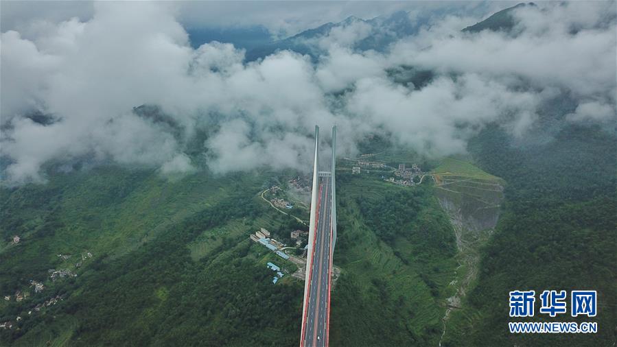 當(dāng)日,杭瑞高速貴州省畢節(jié)至都格(黔滇界)公路北盤江大橋上云霧繚繞,美景如畫(huà)。北盤江大橋主橋跨徑720米,橋面到谷底垂直高度565米。