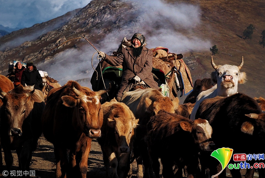 新疆阿勒泰天氣轉(zhuǎn)冷 牧民收拾行囊準(zhǔn)備遷徙