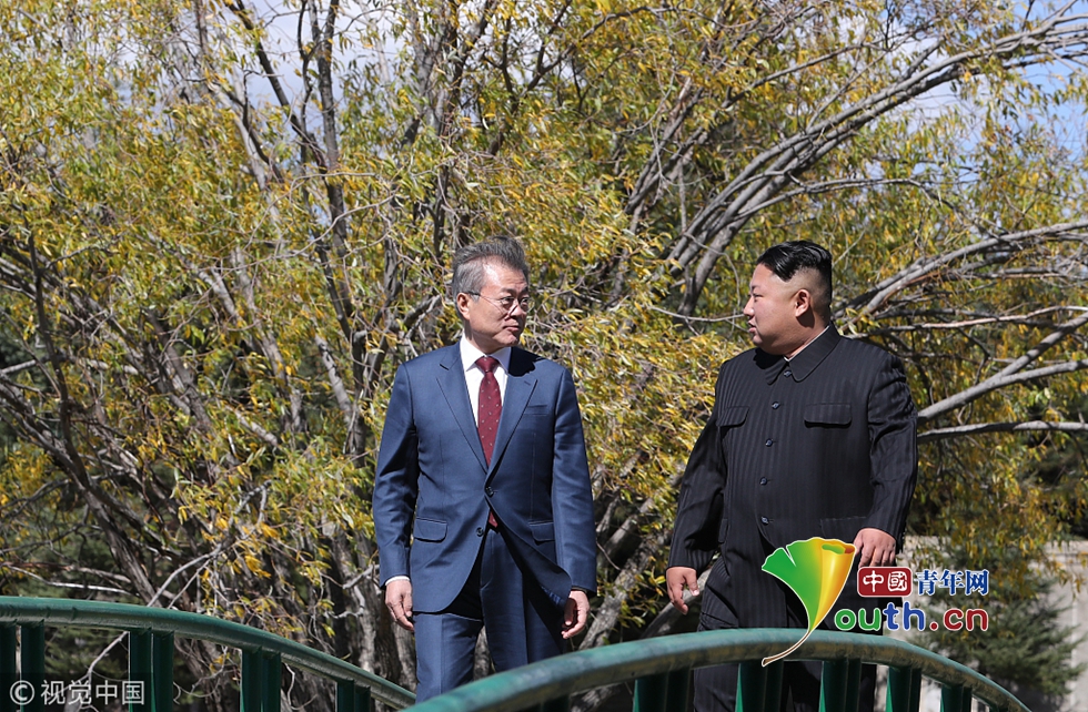 當(dāng)?shù)貢r(shí)間2018年9月20日,朝鮮,韓國(guó)總統(tǒng)文在寅和朝鮮領(lǐng)導(dǎo)人金正恩在三池淵招待所共進(jìn)午餐后散步。圖片作者:Yonhap News Agency/視覺中國(guó)