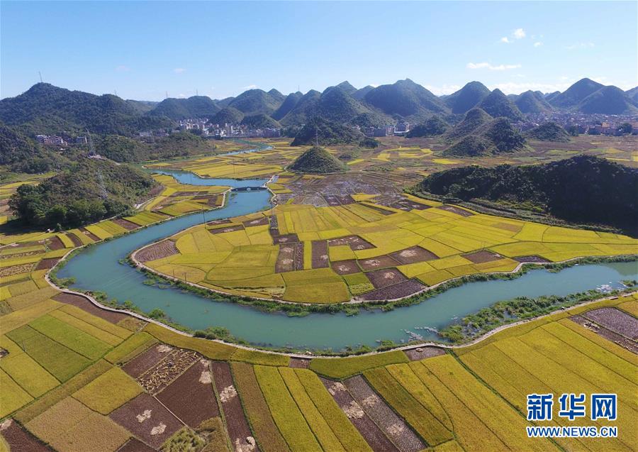 這是廣南縣八寶鎮(zhèn)壩龍村的稻田景色(9月20日無人機(jī)拍攝)。 云南省文山壯族苗族自治州廣南縣八寶鎮(zhèn)今年種植優(yōu)質(zhì)水稻22000余畝,秋收季節(jié),田野里一片金黃,景色如畫。 新華社記者楊宗友攝