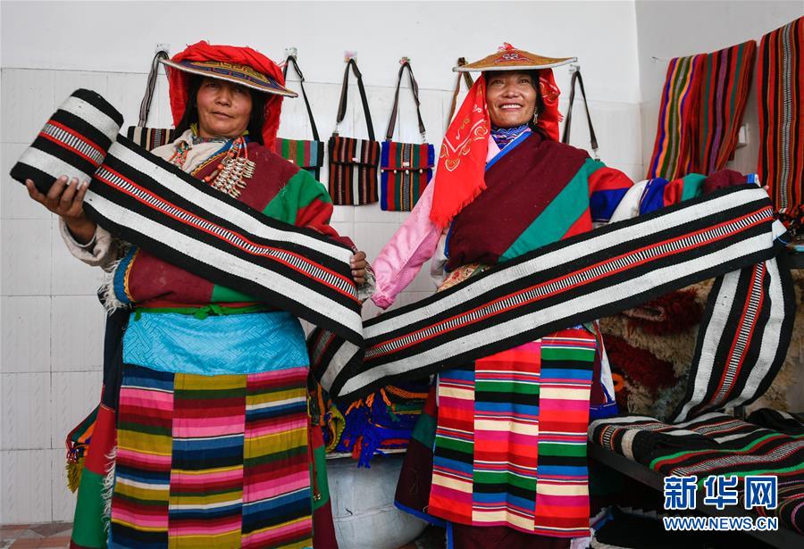 員工益西措姆(左)與嘎措在鹽湖鄉(xiāng)羌麥村民族手工編織廠展示產(chǎn)品(9月19日攝)。 2018年,西藏阿里地區(qū)革吉縣鹽湖鄉(xiāng)政府自籌資金成立羌麥村民族手工編織廠,編織廠將當(dāng)?shù)貍鹘y(tǒng)手工編織技藝與市場需求相結(jié)合,生產(chǎn)手提包、圍脖、腰帶、毛毯、藏式頭巾等產(chǎn)品,并參加旅游推介活動,拓寬編織品銷售渠道,助力當(dāng)?shù)鼐用衩撠殹?新華社記者 劉東君 攝