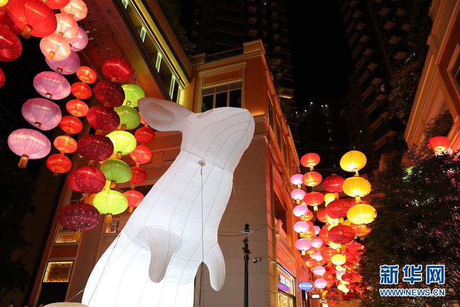9月21日,彩色燈籠和“月兔”花燈裝扮香港利東街夜景。中秋節(jié)臨近,香港喜慶氣氛日濃。新華社記者吳曉初攝