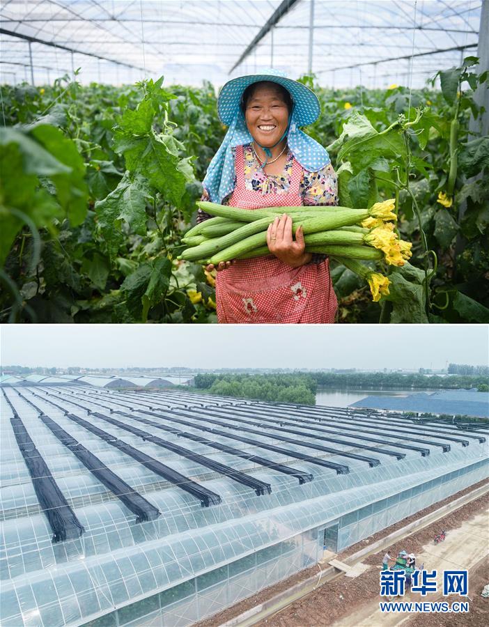 這張拼版照片顯示的是:上圖,9月21日,在江蘇省響水縣九豐現(xiàn)代高效農(nóng)業(yè)示范園的大棚內(nèi),56歲的農(nóng)民徐曉菊展示收獲的絲瓜;下圖,9月21日,徐曉菊(中)和村民一起搬運(yùn)收獲的絲瓜(無(wú)人機(jī)拍攝)。  新華社記者季春鵬攝