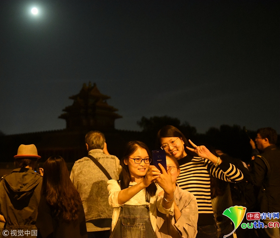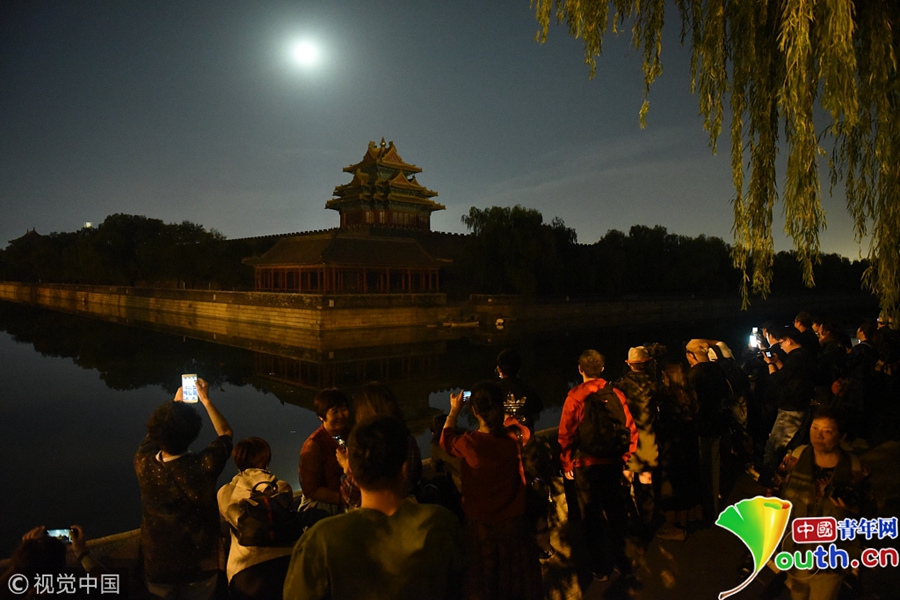 中國青年網(wǎng)北京9月25電 2018年9月24日,中秋節(jié),北京故宮西北角樓,許多市民和攝影愛好者聚集故宮角樓下拍攝月亮。圖片作者/視覺中國