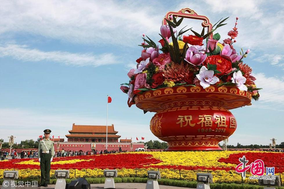 2016年天安門廣場大花籃籃體設(shè)計(jì)參考了清代畫家丁亮光“四季花籃”的畫作,花壇高17米,籃體高15.3米,直徑50米?;@中花材以牡丹、玉蘭、荷花、月季為主,配以“梅、蘭、竹、菊”等,籃體鑲嵌“祝福祖國”及“歡度國慶”文字以及1949-2016年號,表達(dá)對祖國繁榮富強(qiáng)、欣欣向榮的美好祝福。