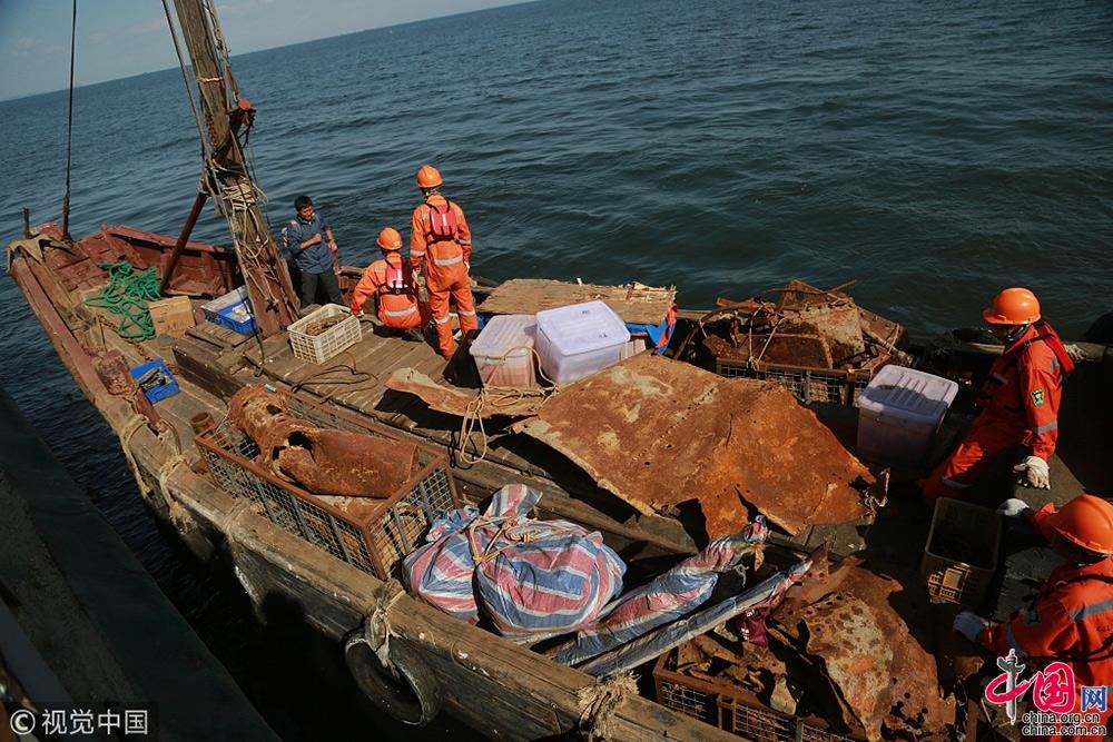 2018年9月25日,遼寧大連,考古工作人員把出水的經(jīng)遠艦遺物進行轉(zhuǎn)運。視覺中國