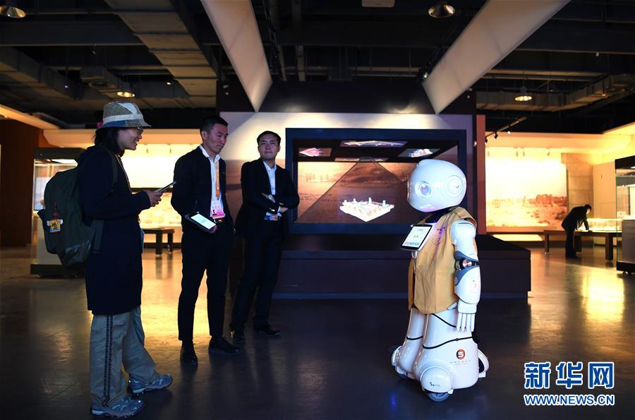 9月27日,在敦煌國際會(huì)展中心,機(jī)器人為參觀者講解“古道天馬——絲綢之路上的交通”展覽。 新華社記者范培珅攝