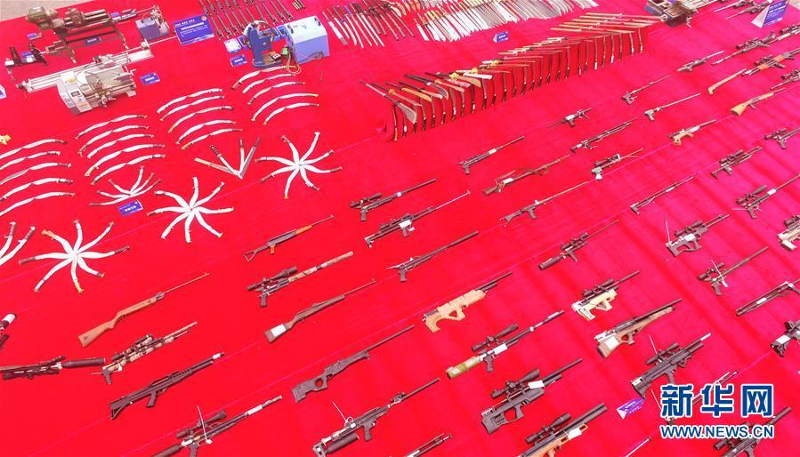 9月20日,非法槍支等物品在全國公安機關(guān)集中統(tǒng)一銷毀非法槍爆物品活動重慶現(xiàn)場展示(無人機拍攝)。 新華社記者 王全超 攝