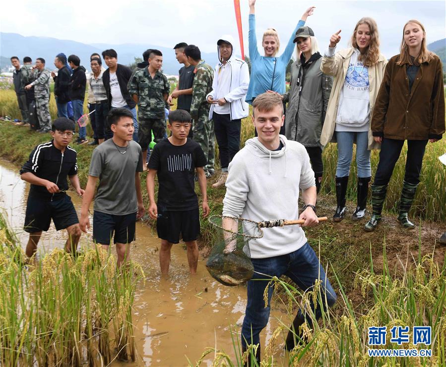 9月29日,外國游客體驗摸魚。9月29日,云南省尋甸回族彝族自治縣2018年首屆農民豐收節(jié)暨第二屆摸魚節(jié)在雞街鎮(zhèn)舉行,當?shù)剞r民和游客在豐收的稻田里進行摸魚、拔谷穗、山歌對唱等活動,享受收獲的喜悅。新華社記者楊宗友攝