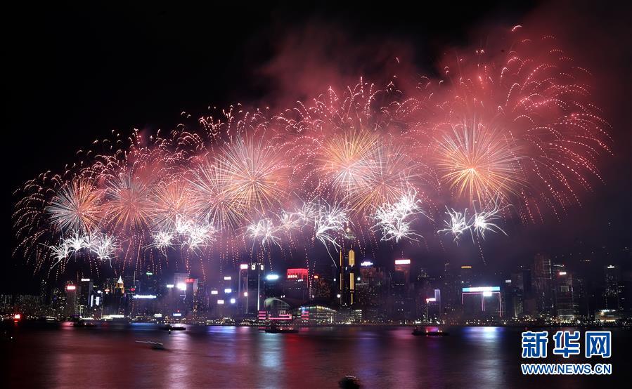 這是10月1日晚拍攝的香港維多利亞港煙花匯演。當晚,香港維多利亞港舉行煙花匯演,慶祝中華人民共和國成立69周年。新華社記者李鋼攝