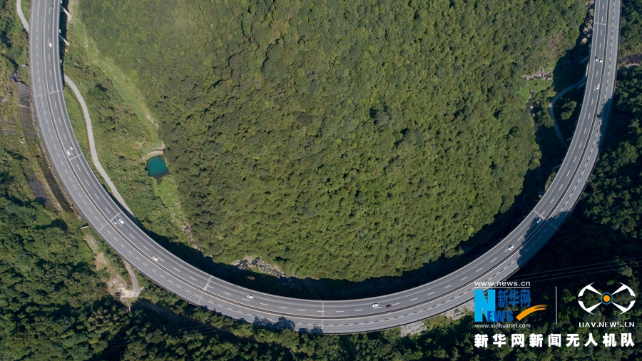 這是廈蓉高速長下坡龍巖路段的道路景觀,高速路走向形成罕見的半圓形。改擴建工程竣工之后,長下坡將改成上行線,變?yōu)樯掀侣范危o人機拍攝)。新華網(wǎng) 肖和勇 攝