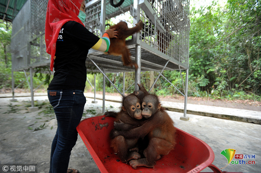 印尼加里曼丹克塔邦,國際動物救援(IAR)猩猩安全與保護(hù)中心里,飼養(yǎng)員用獨(dú)輪車把猩猩寶寶送到森林學(xué)校。圖片作者:Newscom