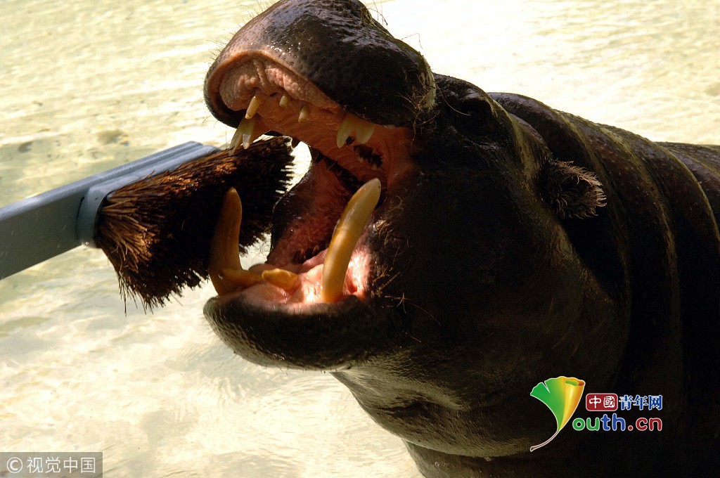 2006年7月20日,英國倫敦動物園里,工作人員正在用一個新的5英尺長的牙刷給河馬Thug刷牙。動物園里的兩只河馬Nicky與Thug,它們分別有一個粉色和藍(lán)色的牙刷。為了慶祝換新牙刷,倫敦動物園將在23日“不要忘記牙刷日”實(shí)行入園半價優(yōu)惠。