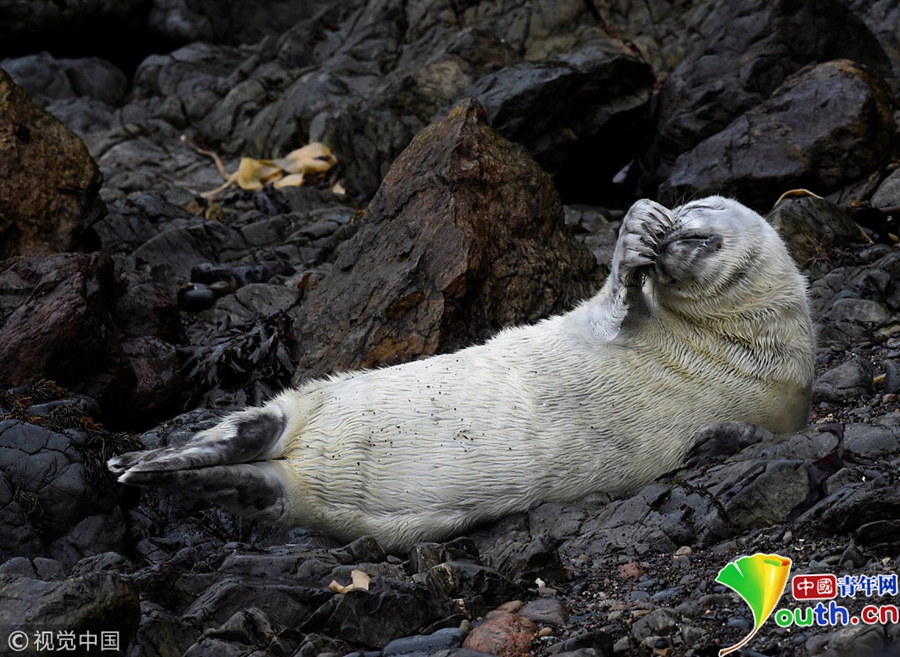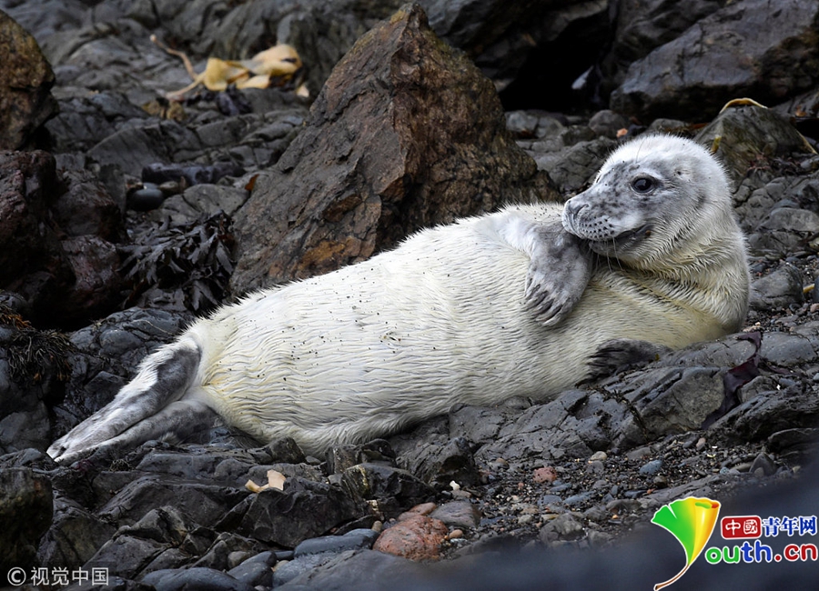 中國青年網(wǎng)北京10月9日電 當(dāng)?shù)貢r間2018年10月8日,英國彭布羅克郡,一只大西洋海豹幼崽躺在海邊礁石上。海豹幼崽出生時都有毛茸茸的白色非防水皮毛,它們會在第四周蛻皮。