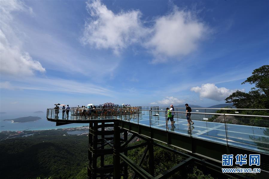 8月31日,游客在玻璃棧道上參觀游覽。近日,位于海南省三亞市亞龍灣熱帶天堂森林公園的大佛石全海景玻璃棧道開(kāi)始正式營(yíng)業(yè)。凌空而建的玻璃棧道全長(zhǎng)400米,游客可將亞龍灣的美景盡收眼底。新華社記者郭程攝