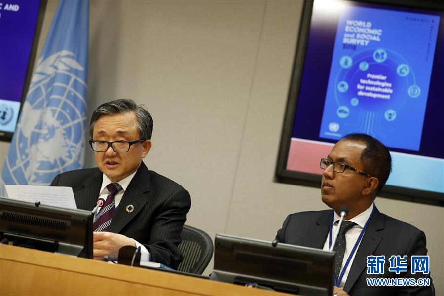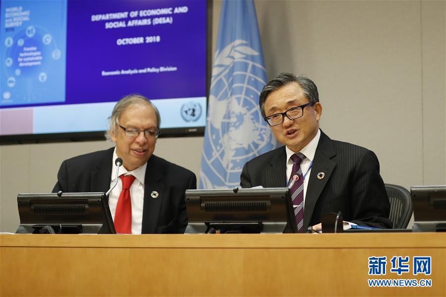 10月8日,在位于紐約的聯(lián)合國總部,聯(lián)合國負責(zé)經(jīng)濟和社會事務(wù)的副秘書長劉振民(左)向記者介紹《2018年世界經(jīng)濟和社會概覽》。新華社記者李木子攝