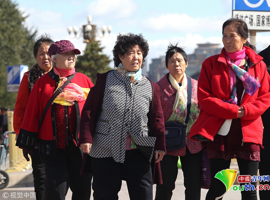 中國(guó)青年網(wǎng)北京10月10日電 2018年10月9日,北京,游客紛紛著秋冬裝游覽天安門廣場(chǎng)。當(dāng)天北京冷空氣來襲。圖片來源:視覺中國(guó)
