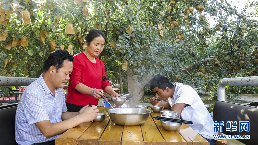 甘永軍(左一)在地處新疆阿克蘇地區(qū)柯柯牙綠化工程內的果園吃飯(2017年9月22日攝)。10年前,甘永軍還在果園開起了第一個農(nóng)家樂,帶動周邊100多戶果農(nóng)經(jīng)營起了自家庭院。 在世界第二大流動性沙漠——塔克拉瑪干沙漠西北邊,一條逾百萬畝的人工林帶傲然挺立。 這條林帶就是柯柯牙荒漠綠化工程。它是新疆阿克蘇黃沙漫漫和碧波萬頃的分界嶺。 1986年,為改變惡劣的自然條件,阿克蘇啟動柯柯牙綠化工程。30年間,各族干部群眾攜手奮斗,曾是沙塵暴策源地的柯柯牙綠樹成蔭;并以此為原點,在南疆戈壁荒灘上孕育出百萬畝的“綠?!薄?30多年來,阿克蘇打造出“人走政不息”的樣本,使綠色發(fā)展理念成為幾代人的廣泛共識;“自力更生、艱苦奮斗、無私奉獻”的柯柯牙精神,已融入各族兒女血液中;“以林養(yǎng)林”“邊綠化邊脫貧”的綠化、脫貧方式,給其他荒漠地區(qū)貢獻了“柯柯牙智慧”。 新華社記者 杜剛 攝
