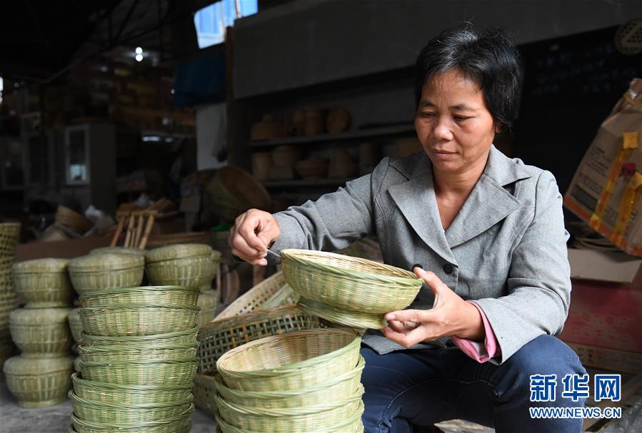 10月11日,在廣西靈山縣平南鎮(zhèn)硤木村一家竹編企業(yè),員工在加工竹編產(chǎn)品。
