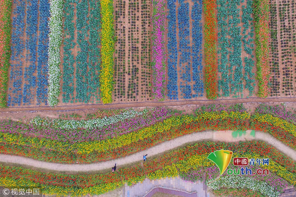 2018年10月14日,江蘇南京,江寧區(qū)谷里街道徐家院村的50萬株百日菊競相綻放,大紅、黃色、紫色……遠遠望去仿佛是田野間鋪上一層“五彩地毯”, 成了金秋里一道花宴盛景,吸引不少游人徜徉其中。圖片作者:方東旭/視覺中國