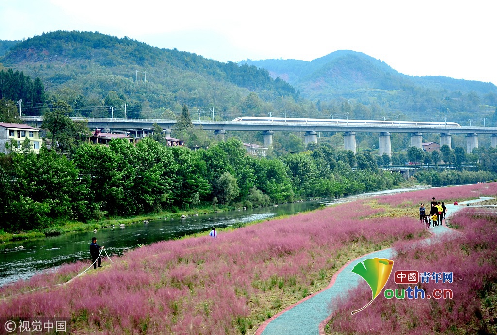 2018年10月14日,陜西漢中,西成高鐵漢中市寧強縣高寨子路段上的一列動車正從紅艷艷的蘆葦花海附近駛過。