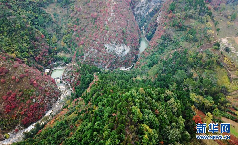這是西狹頌景區(qū)秋景(10月16日無人機(jī)拍攝)。 新華社記者 陳斌 攝