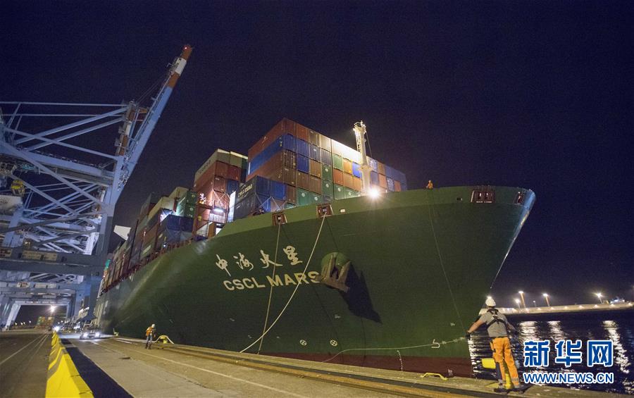 10月15日晚,中遠(yuǎn)海運(yùn)旗下的“中?;鹦恰碧?hào)集裝箱輪停靠在比利時(shí)澤布呂赫港集裝箱碼頭。 新華社記者 葉平凡 攝
