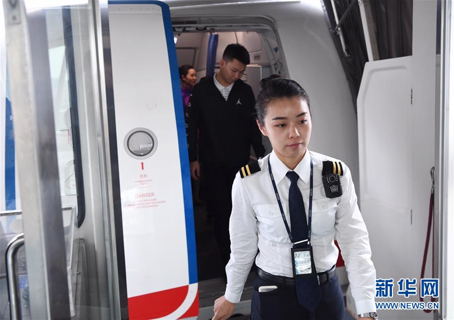 10月16日,航班抵達重慶江北國際機場后,湯春燕第一個走出艙門,準備迎接旅客下機。 新華社記者王全超攝