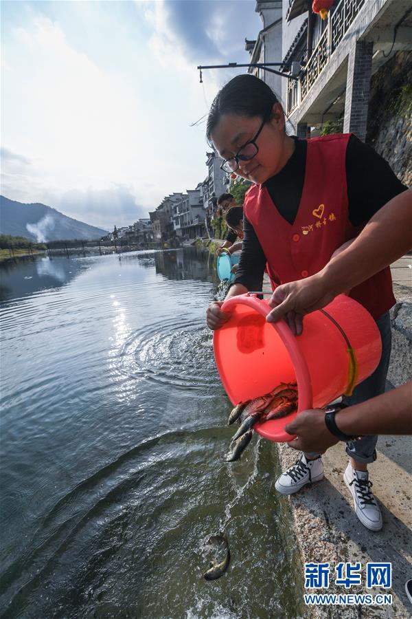 10月17日,河橋鎮(zhèn)的青年黨員們在鎮(zhèn)邊的昌南溪投放魚苗。新華社記者 徐昱 攝