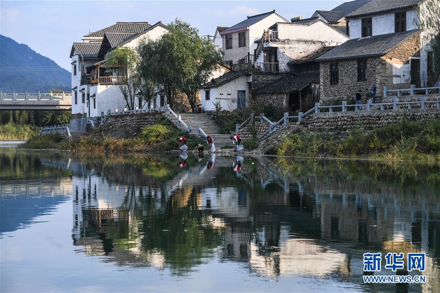 10月17日,河橋鎮(zhèn)的青年黨員們?cè)阪?zhèn)邊的昌南溪邊巡查,并清理兩岸的廢棄物。新華社記者 徐昱 攝