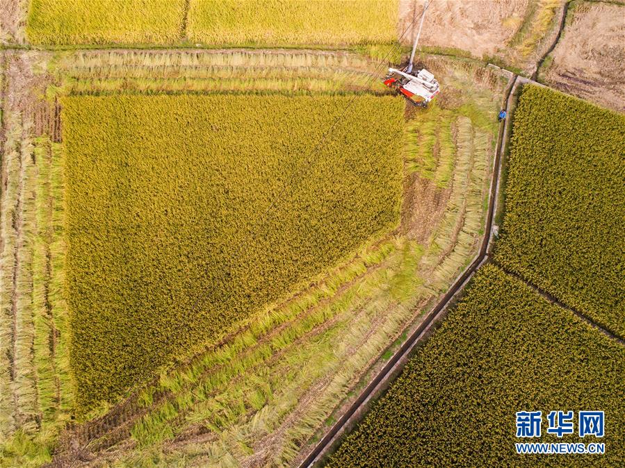 10月17日,工作人員操作收割機(jī)收割水稻(無人機(jī)拍攝)。 新華社記者 徐昱 攝