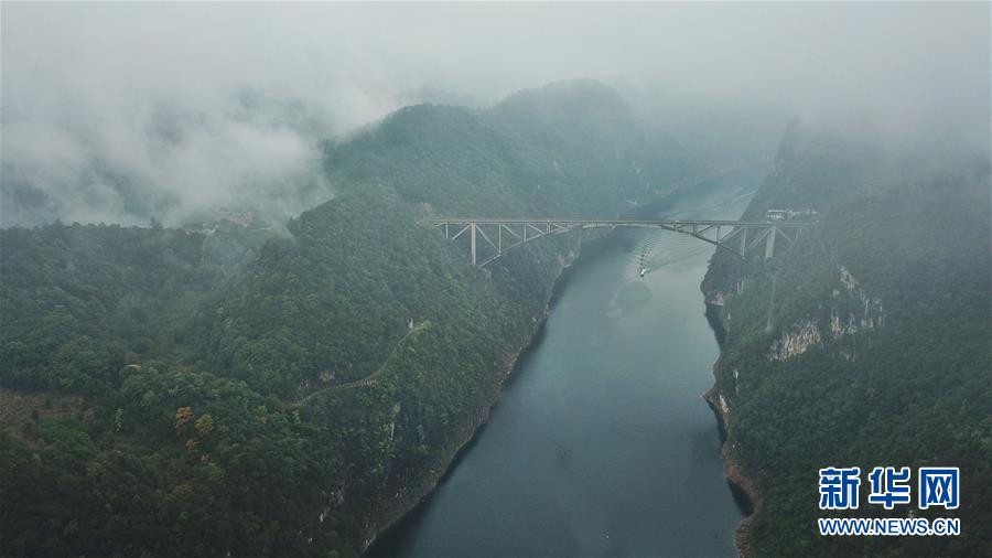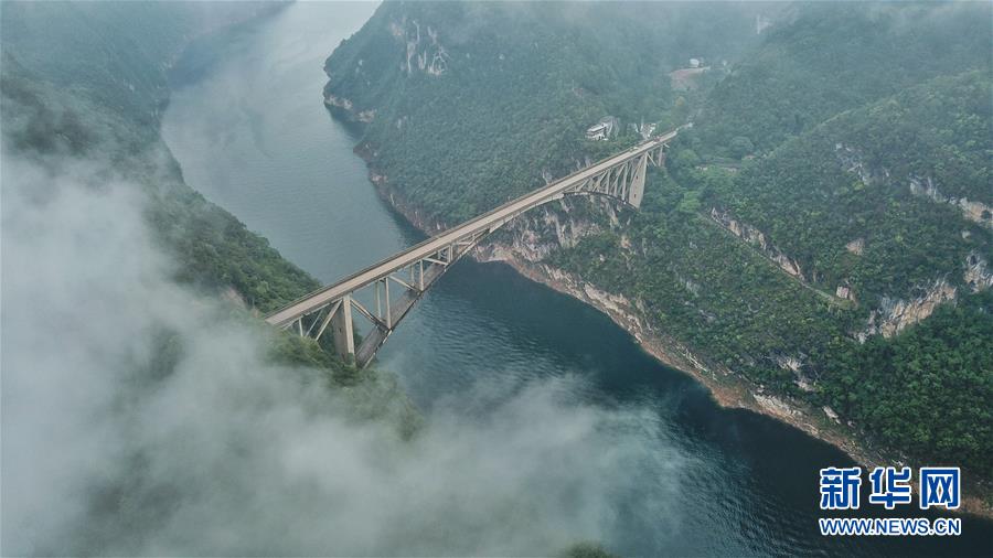 10月18日無(wú)人機(jī)航拍的江界河大橋。 當(dāng)日,位于貴州甕安縣的江界河大橋云霧環(huán)繞,景美如畫。 新華社記者歐東衢攝