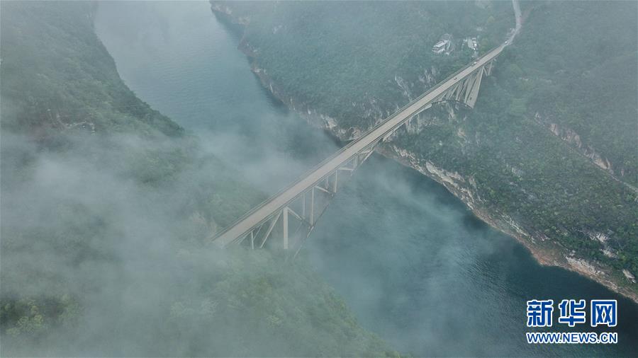 8月27日,位于貴州省甕安縣的清水河大橋云霧繚繞,景色如畫。