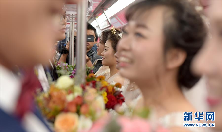 10月18日,在合肥市地鐵一號線車廂內(nèi),新人們互相許諾,期許愛情。 當(dāng)日,中鐵四局集團(tuán)城市軌道交通工程分公司的18對新人在安徽合肥地鐵一號線的車廂里舉行了一場集體婚禮儀式。 新華社記者 郭晨 攝