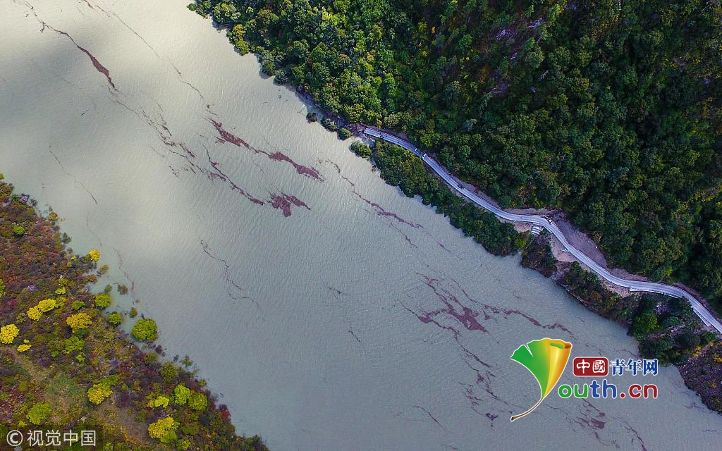 空中俯瞰通往加拉村已淹沒的公路(10月18日攝)。  新華社記者 普布扎西攝