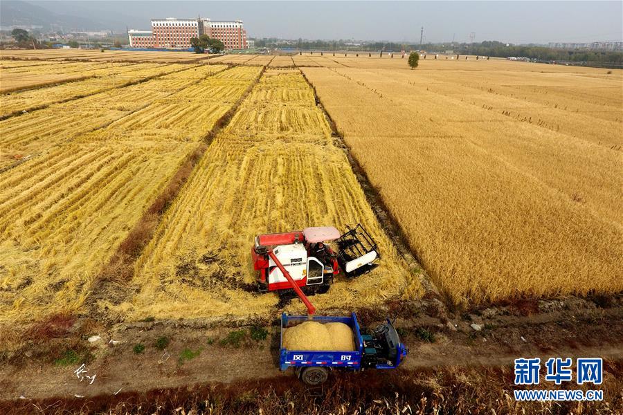 在太原市晉源區(qū)赤橋村,收割機在稻田里作業(yè)(10月17日無人機拍攝)。近日,山西省太原市晉源區(qū)2000多畝水稻迎來收割季。 金秋時節(jié),農(nóng)民們忙著收獲成熟的農(nóng)作物,喜迎豐收。 新華社記者 詹彥 攝