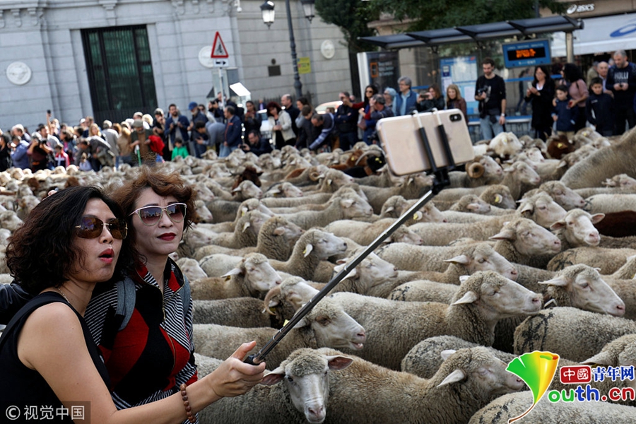 西班牙牧羊人驅趕羊群穿越馬德里 羊群進城“參觀”