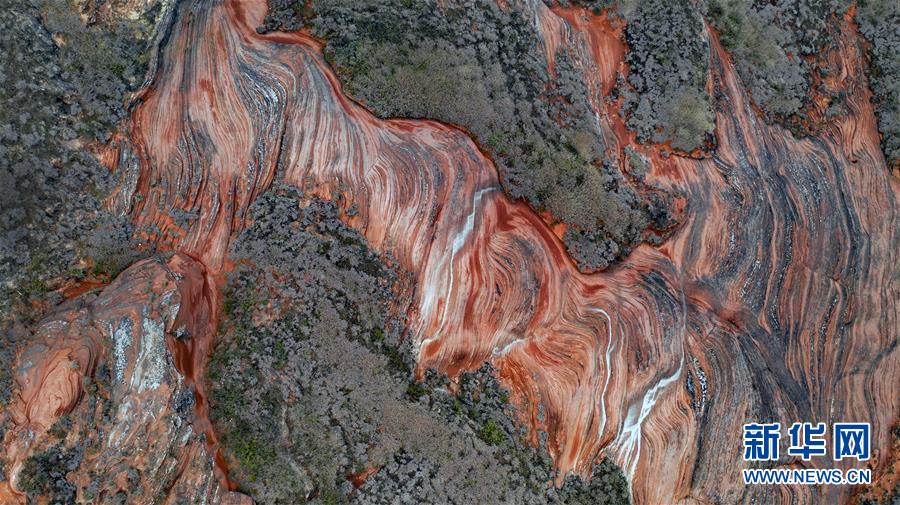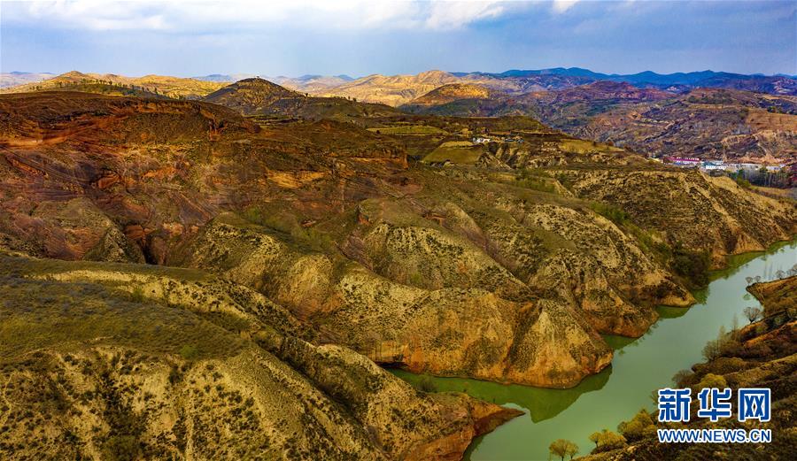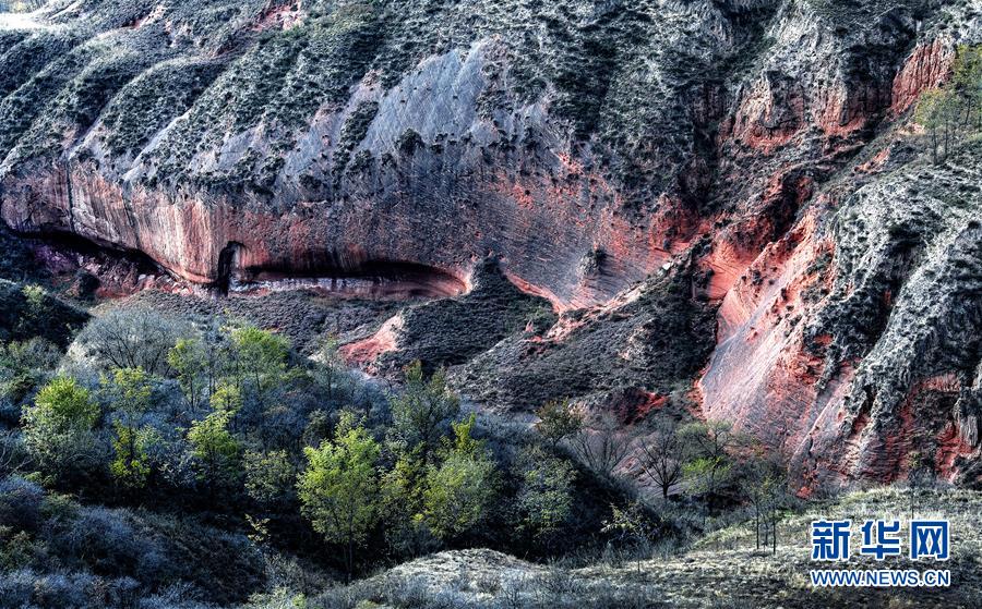 在黃土高原的陜西省延安市安塞區(qū)坪橋鎮(zhèn)王家灣,有一處峽谷丹霞地貌,是2017年陜西省地質調查院在陜北及渭北地區(qū)發(fā)現大規(guī)模丹霞地貌的一部分。這里的山勢頂部被黃土覆蓋,底部經流水下切侵蝕紅色砂巖外露,出露的巖石紋理如波浪,深秋中猶如一幅流動的畫卷。