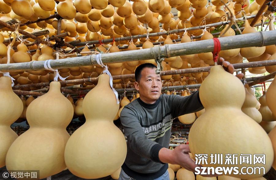 山西聞喜縣禮元鎮(zhèn)阜底村農(nóng)民趙雙慧在晾曬豐收的葫蘆。