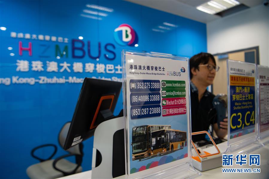 位于港珠澳大橋澳門邊檢大樓的穿梭巴士售票處(10月19日攝)。 港珠澳大橋?qū)⒂诒驹?4日通車運營,成為連接香港、澳門的新通道。記者19日驅(qū)車前往澳門口岸實地采訪,了解口岸內(nèi)部設(shè)置和準備工作情況。 新華社記者 張金加 攝