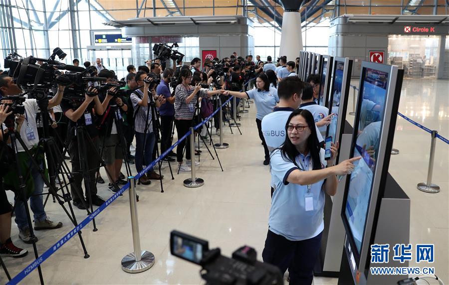 10月19日,在香港口岸旅檢大樓,工作人員在穿梭巴士自助售票機前演示購票過程。 港珠澳大橋開通在即。 新華社記者 李鋼 攝