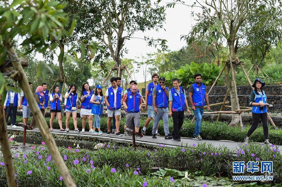 在??谑忻郎岷峪P翔濕地公園,參加濕地保護(hù)志愿服務(wù)講解員培訓(xùn)的留學(xué)生志愿者一邊參觀一邊聽中國志愿者講解(10月21日攝)。 ??谑续P翔濕地公園內(nèi)流水潺潺,綠草如茵。很難想象,這個(gè)市民游客休閑散步的好去處、具有強(qiáng)大污水凈化功能的濕地公園,兩年前還是臭氣熏天、人們避之不及的垃圾堆填場。 把生態(tài)文明建設(shè)放到更加突出的位置,近兩年來??谑幸詽竦爻鞘薪ㄔO(shè)為突破口,不斷創(chuàng)新城市生態(tài)治理,著力改善生態(tài)民生,在生態(tài)文明建設(shè)上闖關(guān)探路。 新華社記者 楊冠宇 攝