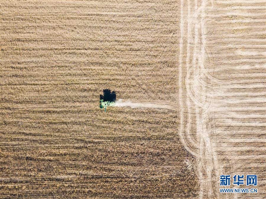 從空中俯瞰俄羅斯猶太自治州比羅比詹市附近的大豆農(nóng)場(chǎng)(10月19日攝)。 新華社記者張若玄攝