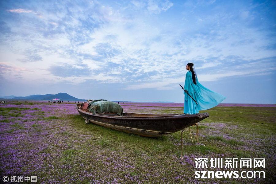 2018年10月23日,南昌,游人在江西鄱陽湖都昌濕地蓼子花海內游玩。連日來,中國第一大淡水湖江西鄱陽湖濕地大面積蓼子花開放,秋景宜人,紫色的花海吸引大批游客前來賞景游玩。