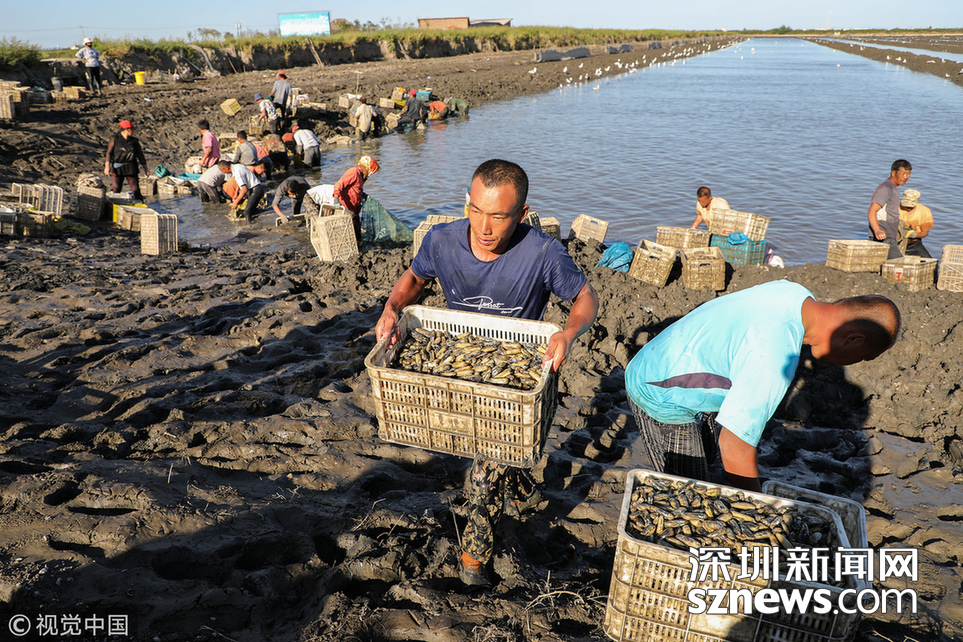 深圳新聞網(wǎng)訊 2018年9月8日,遼寧丹東,早上5點(diǎn),挖蟶人紛紛下到各個(gè)池子,要在海水海泥里艱辛勞作10小時(shí),直至下午3點(diǎn)集體上岸,等待買家的運(yùn)輸車隊(duì)運(yùn)走他們的勞動(dòng)成果。9月初,遼寧沿海養(yǎng)殖區(qū)進(jìn)入養(yǎng)殖海鮮的收獲季。在東港,常常出現(xiàn)數(shù)百人乃至上千人集結(jié)在池子里挖蟶子(這里特指縊蟶,即東港當(dāng)?shù)厝怂f的小人仙。下同)的壯觀景象。在養(yǎng)殖海鮮的收獲季,成群的海鷗趁機(jī)“助陣“,人與大自然和諧共處的畫面令人嘆為觀止。