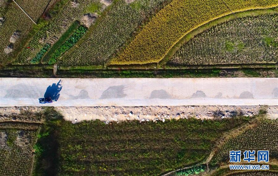 10月30日,曾紀(jì)連載著電影放映設(shè)備穿過(guò)稻田,準(zhǔn)備為村民們放映電影(無(wú)人機(jī)拍攝)。新華社記者 胡晨歡攝