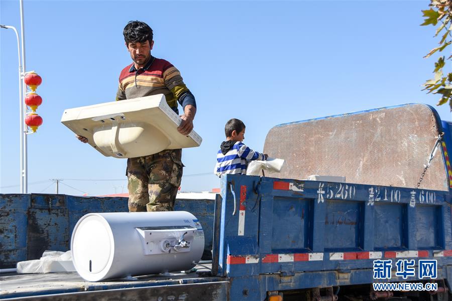 10月28日,買(mǎi)合肉甫·木拉吧在小兒子的幫助下裝運(yùn)貨物。 新華社記者 關(guān)俏俏 攝