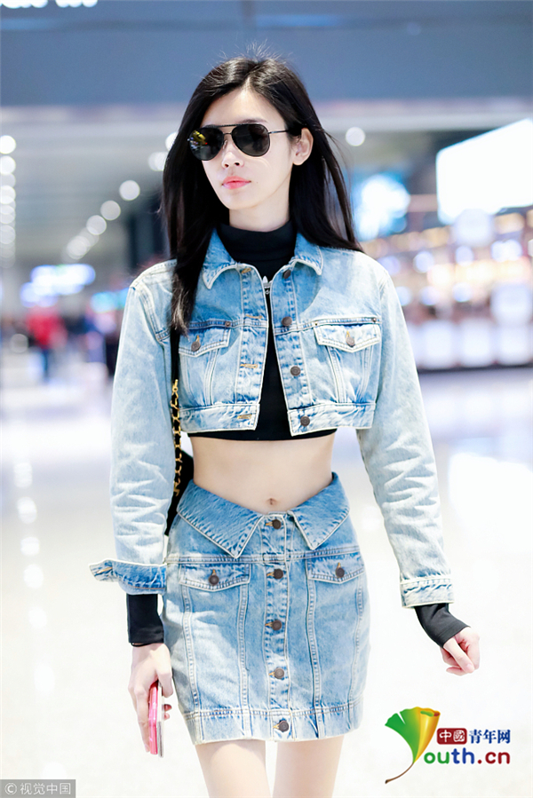 奚夢(mèng)瑤一身帥氣牛仔裝 露細(xì)腰長(zhǎng)腿顯好身材
