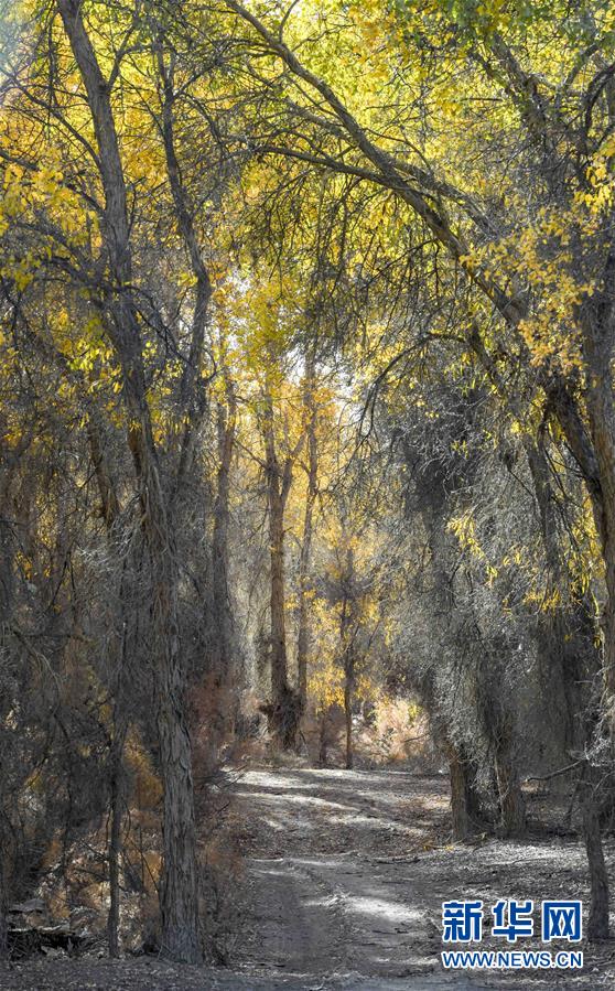 新疆輪臺(tái)縣胡楊林深處的一條小路(10月25日攝)。 10月中下旬,靜靜的塔里木河中下游一片金黃。胡楊深處,條條小路蜿蜒綿長(zhǎng)通向遠(yuǎn)方,引人入勝。 塔里木河是中國最長(zhǎng)的內(nèi)陸河,這一區(qū)域原始胡楊林分布較為集中。隨著塔里木河連續(xù)19次向下游生態(tài)輸水,為胡楊林“解渴”,塔河兩岸生態(tài)得到明顯改善,沙地面積逐年減少。 新華社記者趙戈攝